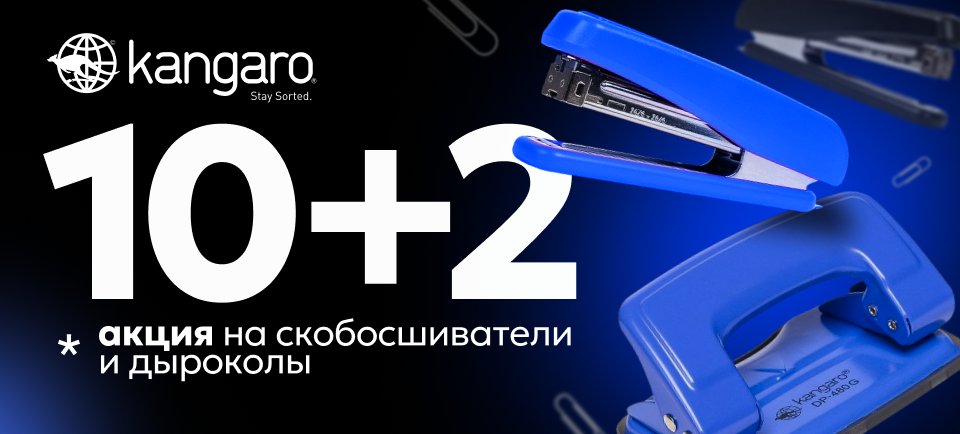 C 1 по 31 августа на Смартон действует специальное предложение на скобосшиватели и дыроколы Kangaro: при покупке 10 единиц из выделенного ассортимента 2 единицы в подарок
