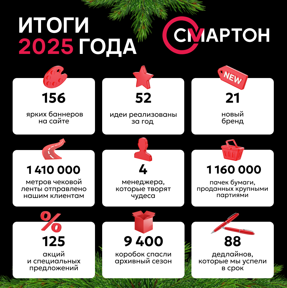 Команда «Смартон» сопровождает клиентов на каждом этапе — от профессиональной консультации до своевременной поставки. Благодарим вас за доверие и сотрудничество в уходящем году. В 2026 году мы продолжаем двигаться вперед, развивая сервис и расширяя ассортимент, чтобы ваш бизнес всегда был обеспечен надежными решениями для роста и новых достижений.
